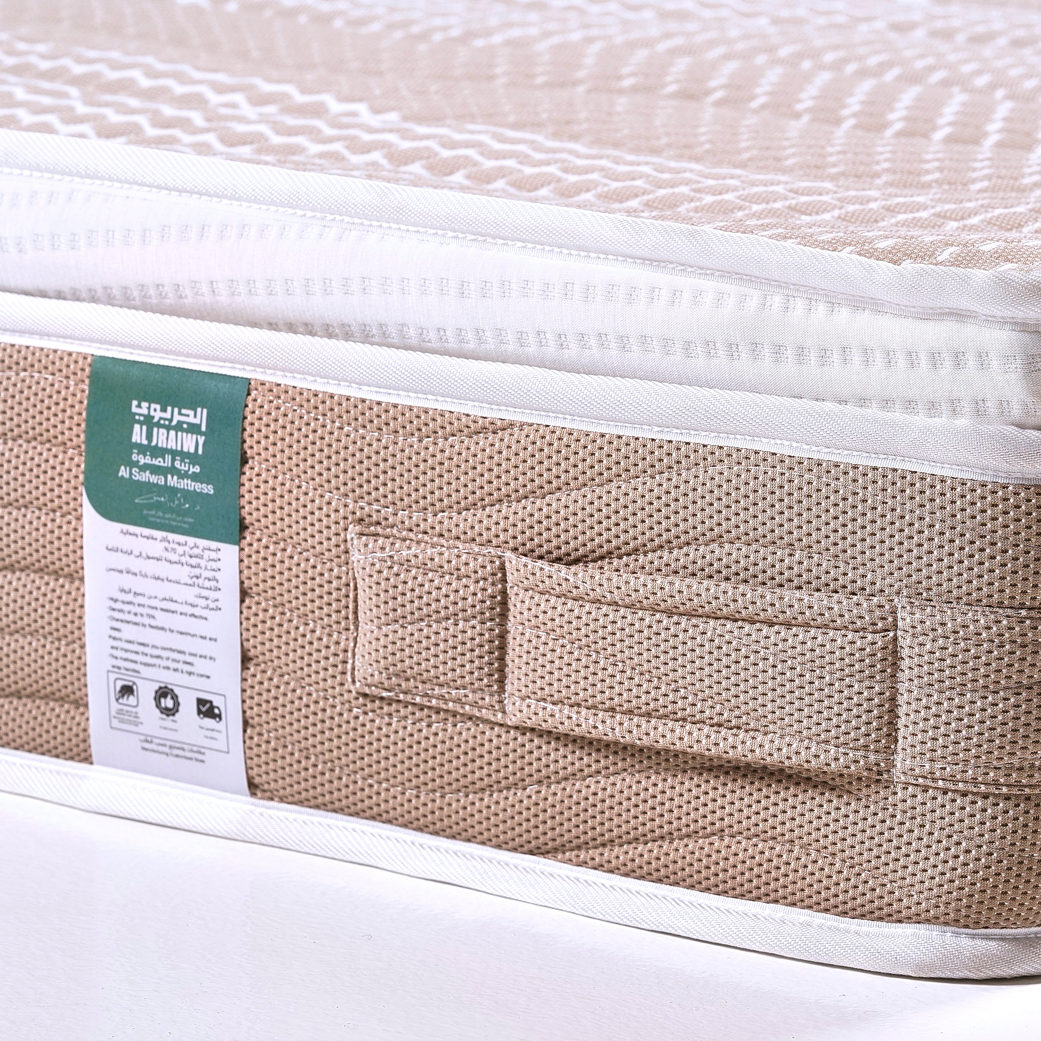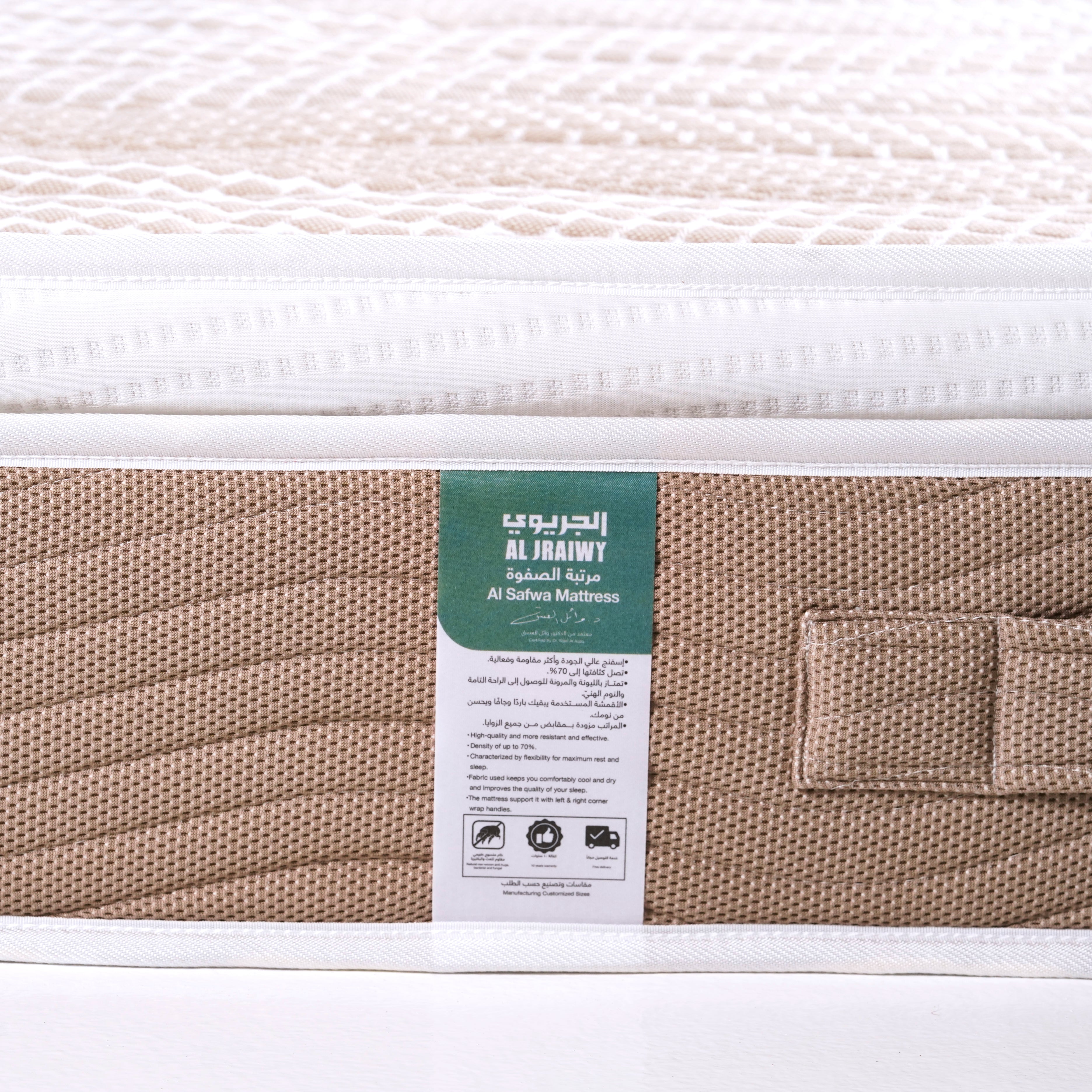 Al Safwa mattress: Ideal for side sleepers, back sleepers, or those who suffer from sleep fluctuations with HR technology. Specially designed to provide maximum support and pressure relief that can help relieve discomfort during sleep. Luxurious breathable fabric that maintains body temperature during sleep. - Free delivery service - 10-year warranty - Natural woven material that is resistant to dust mites and bacteria